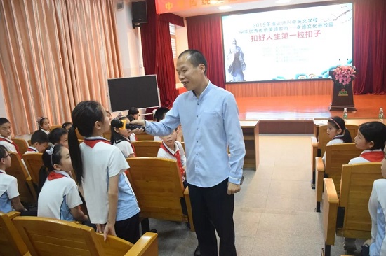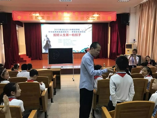 随后,清远市孝德文化促进会卞理会长为师生们开展了孝德文化讲座,卞会长围绕“扣好人生第一粒扣子”“传承好家风好家训”“社会主义核心价值观”等主题,结合学生年龄特点,通过知识讲解、汉字拆分、现场即兴问答、互动展示等环节,深入浅出、富有内涵、生动而又深刻地诠释了孝德文化,大大激发了学生们对传统文化的浓厚兴趣。
